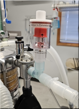 Normally, PEEP valves are confugured to maintain a defined level of positive system pressure )positive end expiratory pressure) which can be beneficial to a certain number of patients. When configured as shown above, as an attachment to a "T" adaptor within the anesthetic system, the PEEP valve allows gas to escape if pressures exceed the PEEP valve pressure rating. You cannot create any harmful effect with this setup. It is mechanically impossible to place the PEEP valve on the "T" adaptor backwards but if you did, it would simply not provide the positive pressure relief that the setup was intended to provide; in other words, you are no worse off than you were without it. To add reverse PEEP valves to your systems you need two inexpensive components: an adaptor "T" and a 20 cmH2O PEEP valve. Both components can be obtained through www.HALLOWELL.com. The total current cost for both components is under $74 USD. Alternatively, other adjustable PEEP valves can be adapted to this purpose if you have the proper reducing adapter as noted below. |